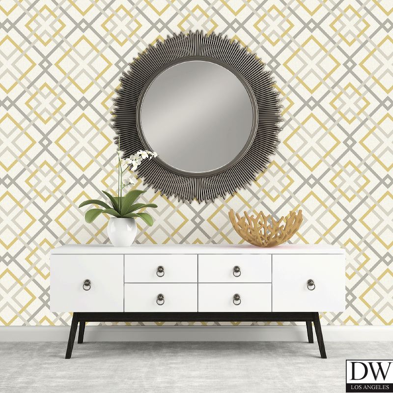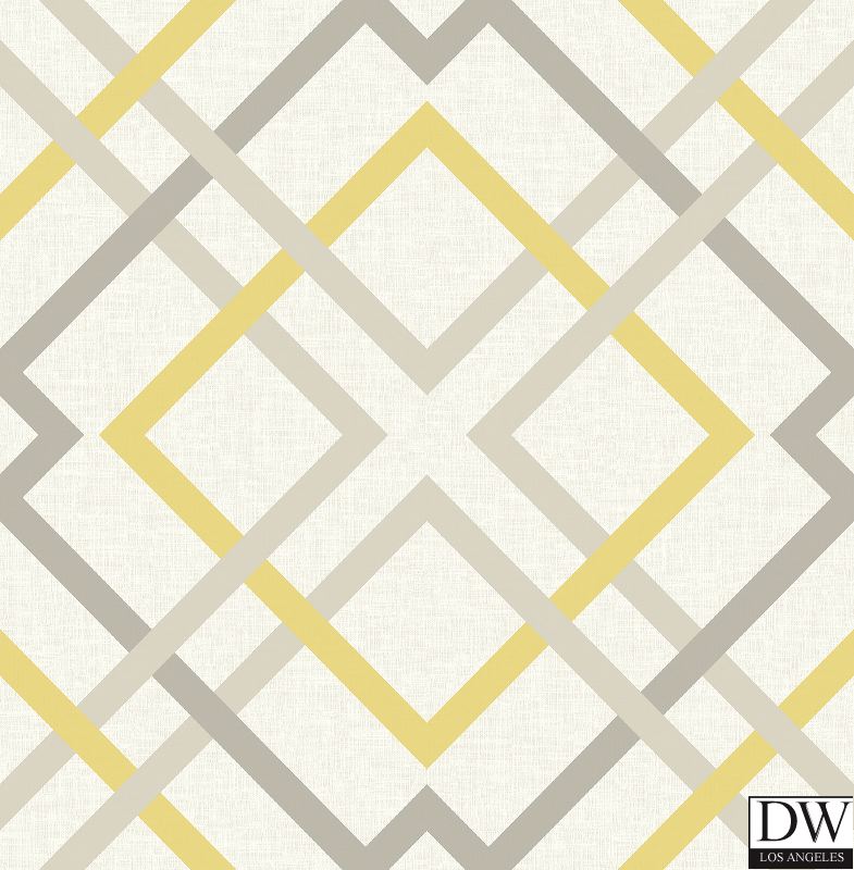 This modern wallpaper features a beige linen background with yellow and metallic bronze print. The large scale design has a variety of interwoven blocks that form an intricate trellis pattern.