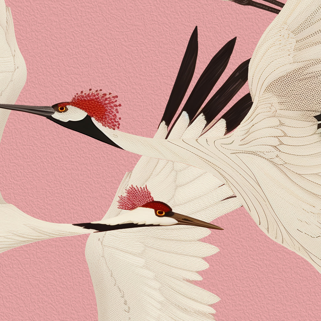 This wallcovering features a graceful pattern of herons in flight, creating a serene and elegant ambiance. The color palette is dominated by soft pinks, whites, and touches of black, evoking a sense of tranquility and sophistication. Ideal for creating a statement wall in boutique residences, upscale hospitality environments, or refined executive offices.