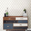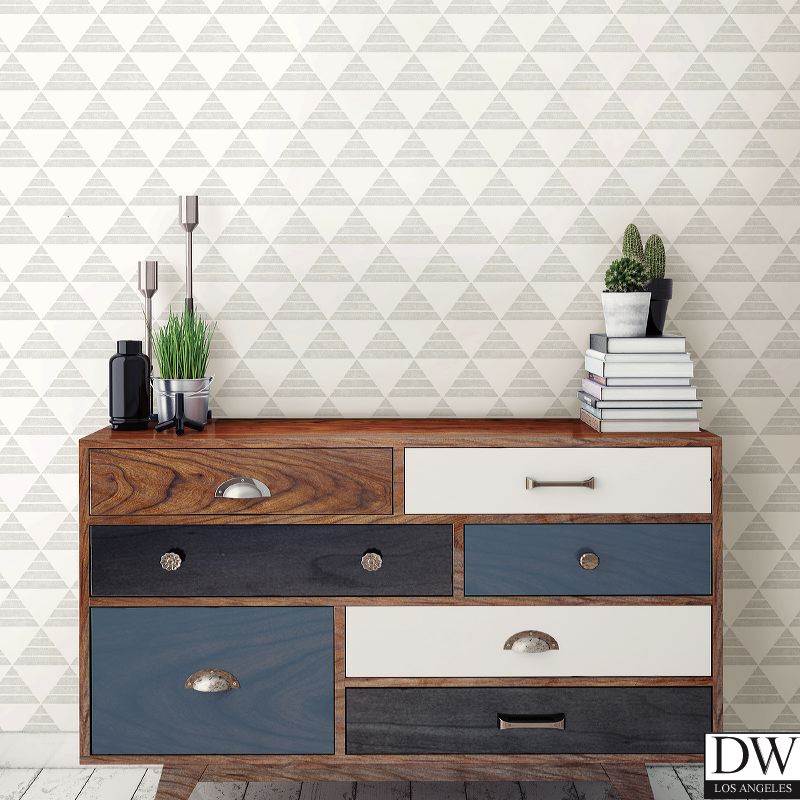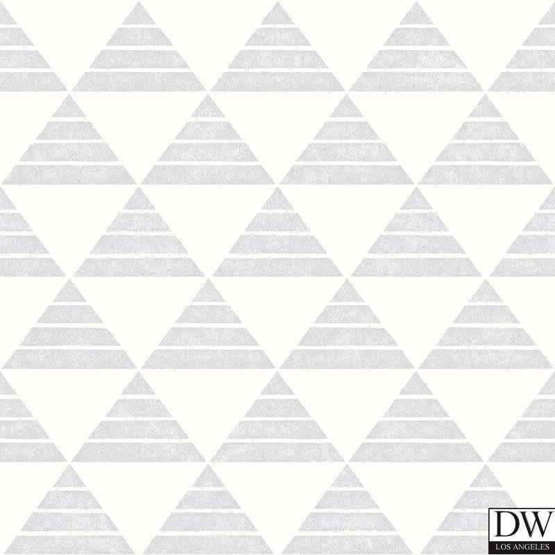 This modern wallpaper has a bright white background and light grey triangles that create a chic design. A distressed effect adds texture to the print.