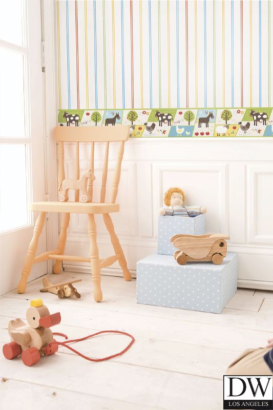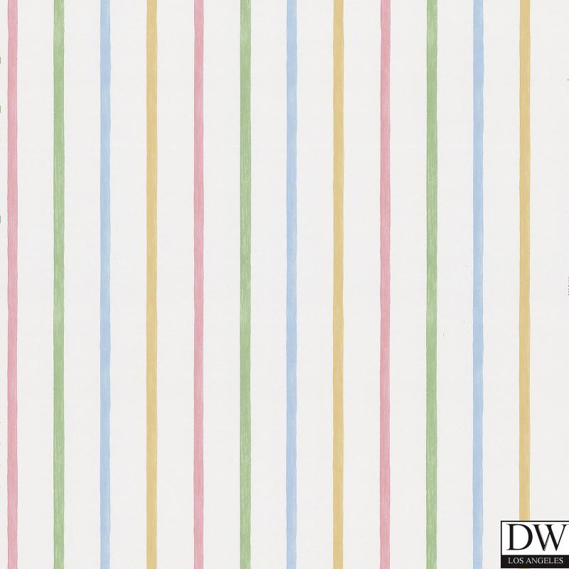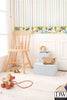 Pink and yellow and green and blue sing a rainbow into the room with this pretty stripe wallpaper.