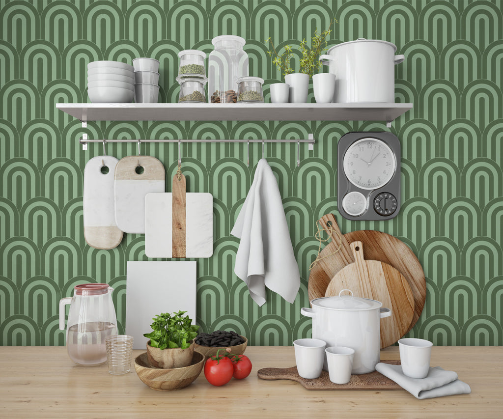 This wallcovering features a bold, repeating pattern of rounded arches, creating a dynamic and rhythmic visual effect. The color palette is a harmonious blend of green and light green, evoking a sense of calm and sophistication. Ideal for adding a touch of retro charm to boutique residences, hospitality environments, or executive offices.