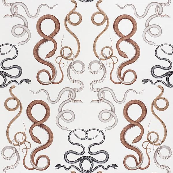 With its cascade of hand-drawn, intertwining snakes, Giove invokes one of the oldest mythological symbols. This beguiling pattern is also available as a fabric.