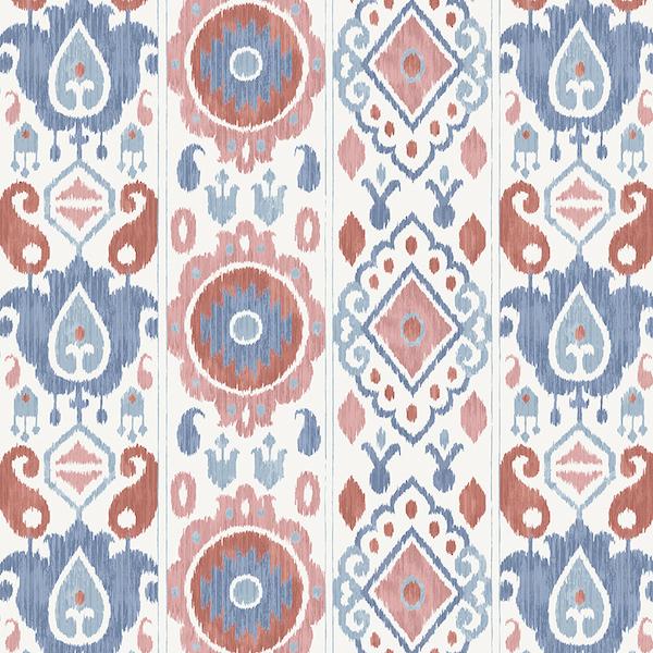 This delicate, muted striped wallcovering captures the look of a warp print ikat with watery colorations and an exotic vibe. Also available as a fabric.