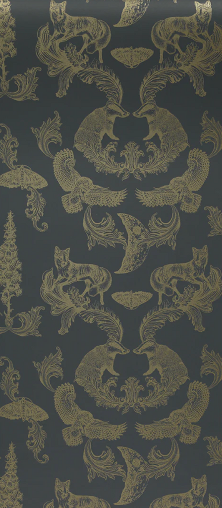 A beautiful wallpaper design by Laura Garner featuring charming hand drawn illustrations of whimsical woodland creatures including badgers, foxes and birds, all of which can be found nestled amidst forest foliage beneath a shimmering golden moon. Set upon a dark charcoal background, this stylish and sophisticated wallpaper is a modern and contemporary twist on the traditional damask style which will look stunning in a rural retreat or city living space.