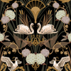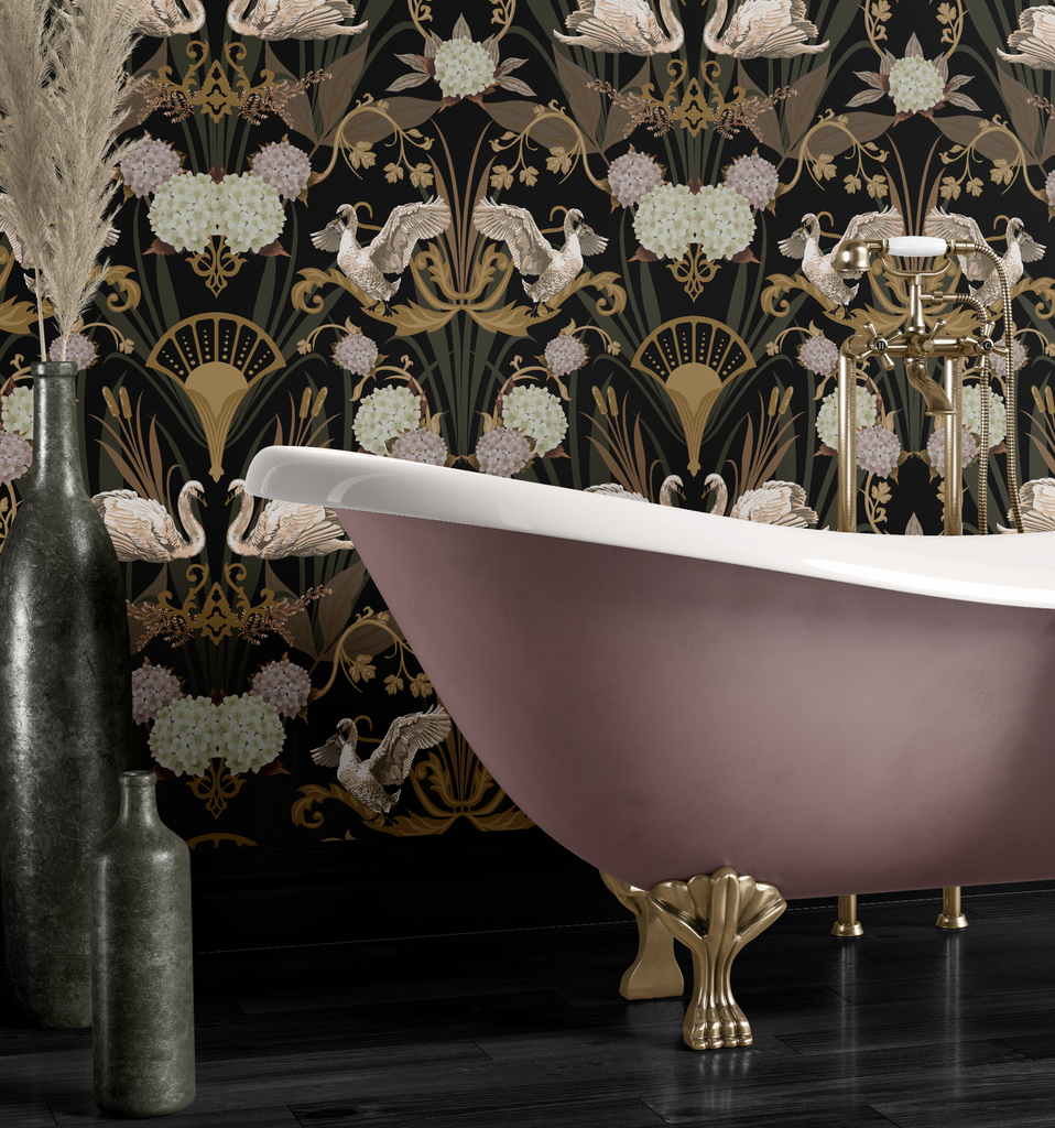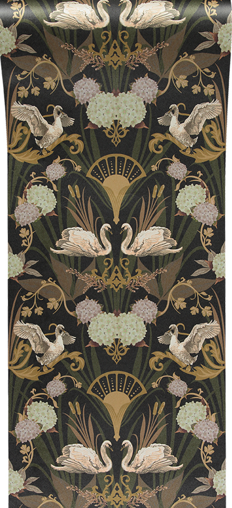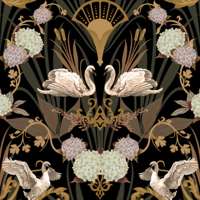 Deco Swan by Becca Who is a stunning design bursting with luxury and elegance. Graceful swans framed by floral hydrangeas and ornamental motifs are brought to life by the subtle shimmering pearlescent finish of the paper. The dark charcoal colourway with its muted earthy tones, is sure to create a bold impact in any interior space.
