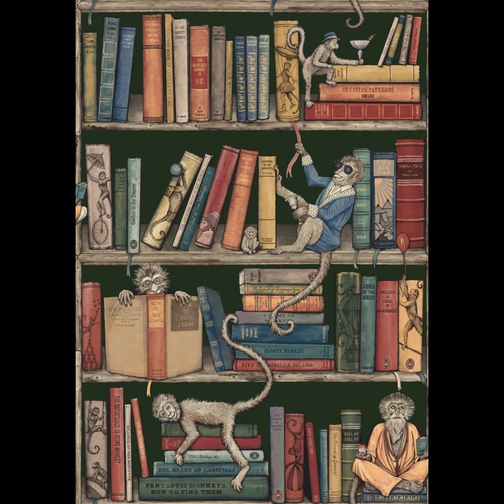 Whimsical monkeys perch among green shelves of books in this playful yet refined wallpaper by Brand McKenzie. A charming twist on tradition. #luxurywalls #interiordetails #artfulinteriors