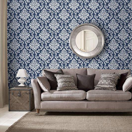 The finesse style of Indian ink takes inspiration from an Indonesian decorative technique, Ikat, which is recognizable for its unique and distinctive style. This ornate archive damask is complimented with an organic finish and beautifully matched with a tribal inky blue pallet and finished off with highlighted neutral creams for a serene and classic look. Quick & easy 'Paste The Wall' application (no decorating table or pre-cutting required). Non-woven wallpaper, won't shrink or expand overtime.Designer Wallcoverings and Fabrics is a leading authorized dealer of Indian Ink Damask Royal Blue Wallpaper