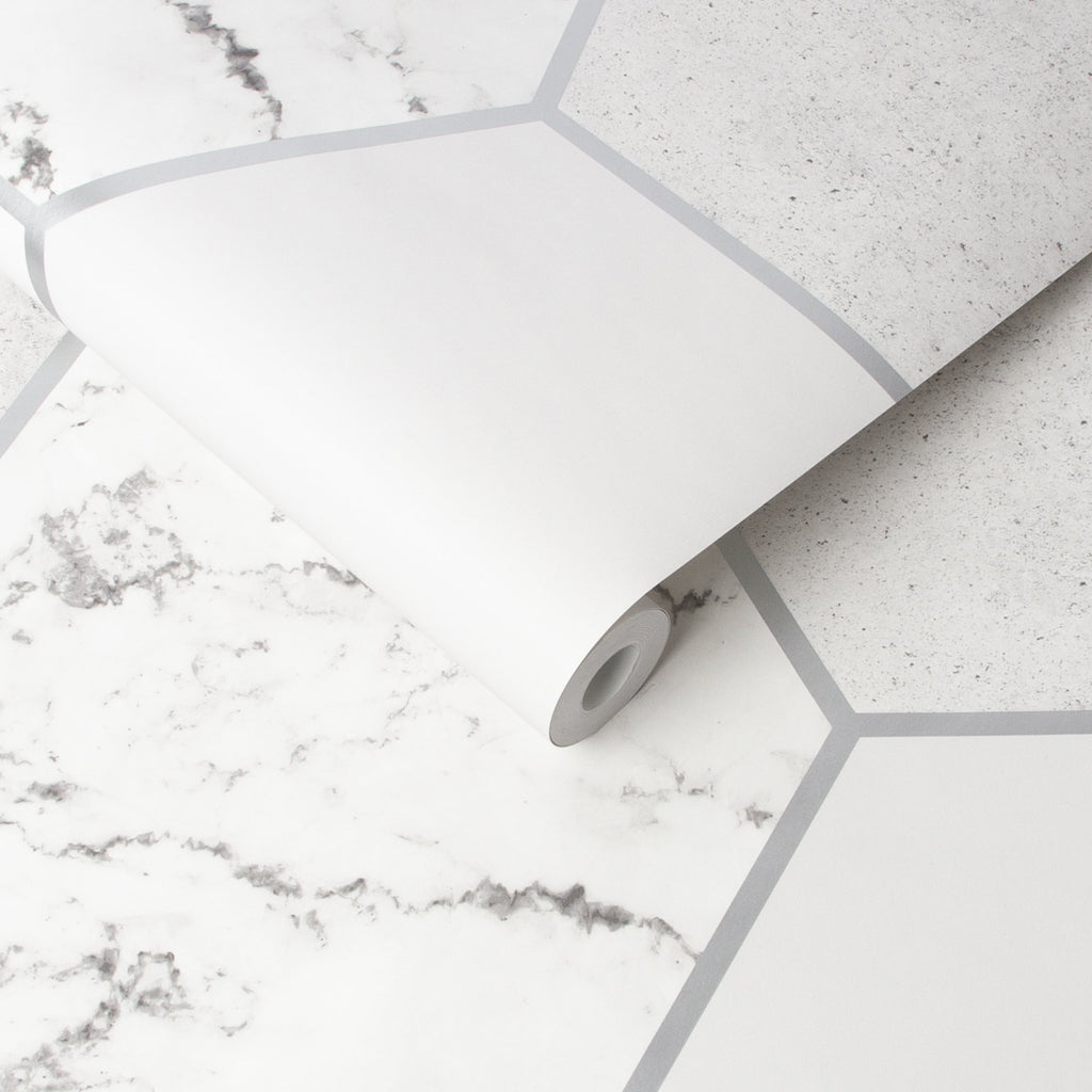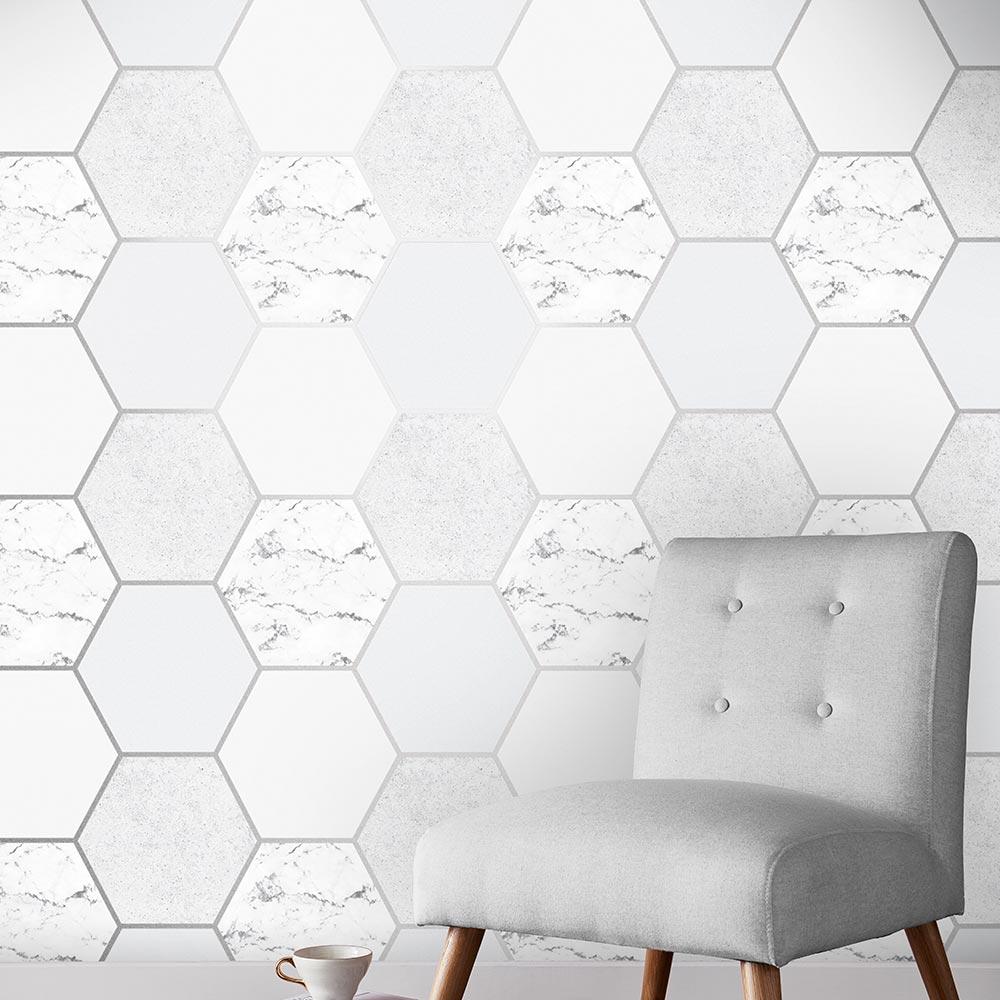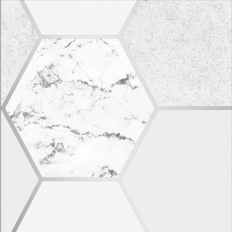 Incorporating tonal grays with marble, stone and metallic highlight creates the beautiful contemporary geometric wallpaper Earthen Grey. Repetitive hexagons form a honeycomb style geometric, which is produced on a luxurious matte paper. Quick & easy 'Paste The Wall' application (no decorating table or pre-cutting required). Non-woven wallpaper, won't shrink or expand overtime.Designer Wallcoverings and Fabrics is a leading authorized dealer of Earthen Grey Wallpaper