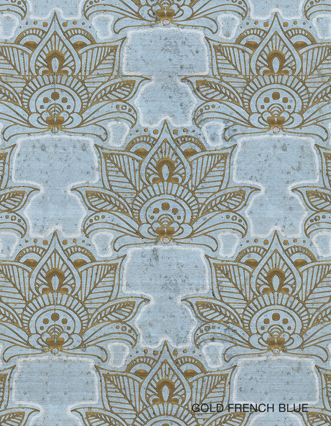 Damask 8 Gold French Blue On Silver Sisal Wallpaper | Paul Montgomery