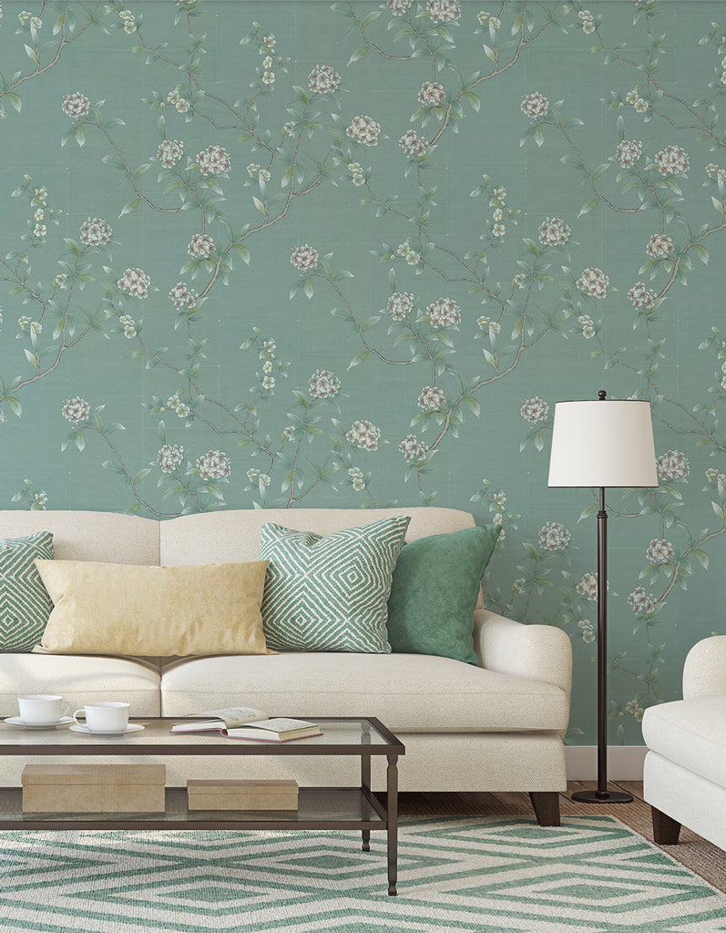 Delicate hydrangea blossoms in soft blue tones dance across a serene, light backdrop in this elegant Paul Montgomery design. A graceful choice to bring floral charm into any interior. #luxurywalls #floralwallpaper #paulmontgomery #interiorsinspiration