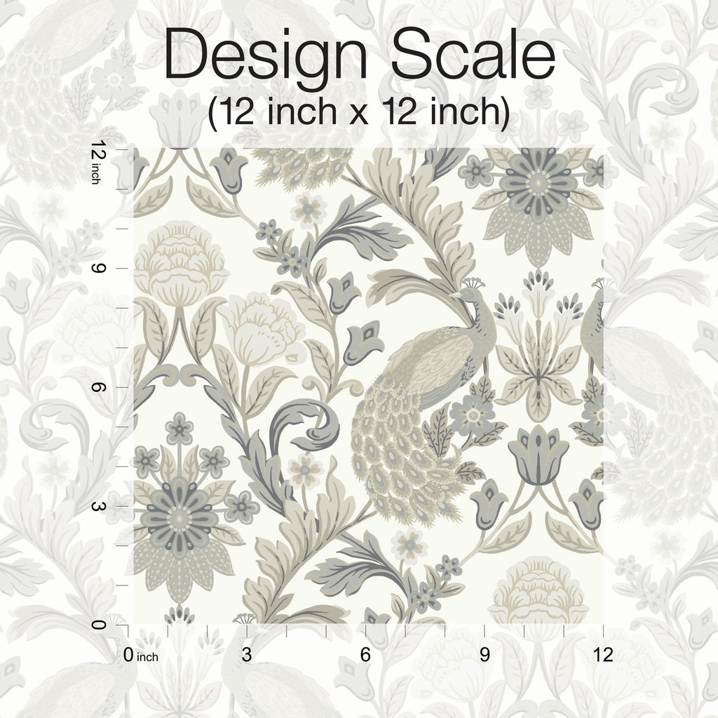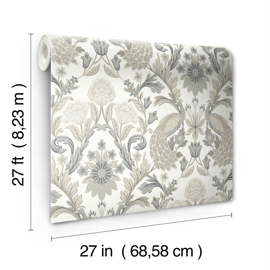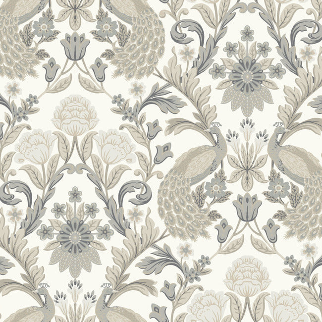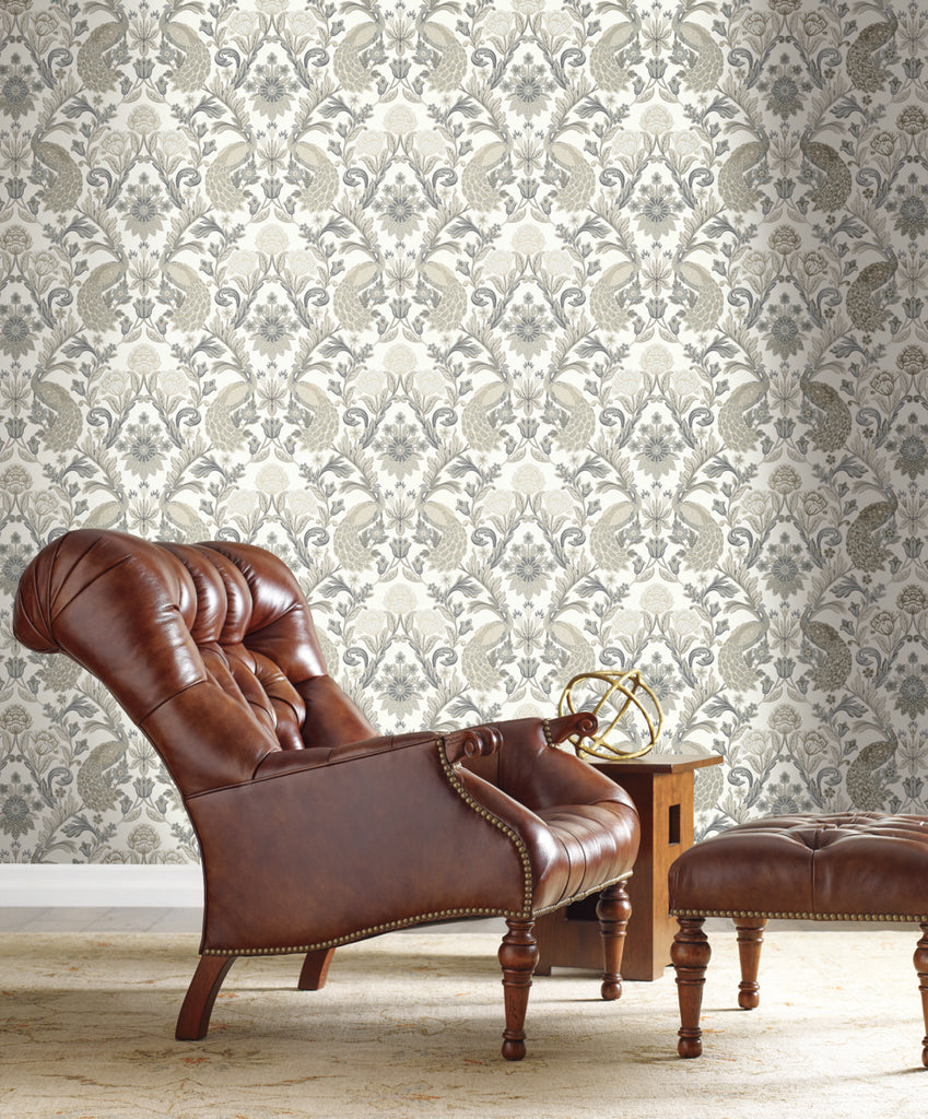 Pattern Plume Dynasty is a lush floral and peacock damask with both touches of modern metallic and old-world charm.