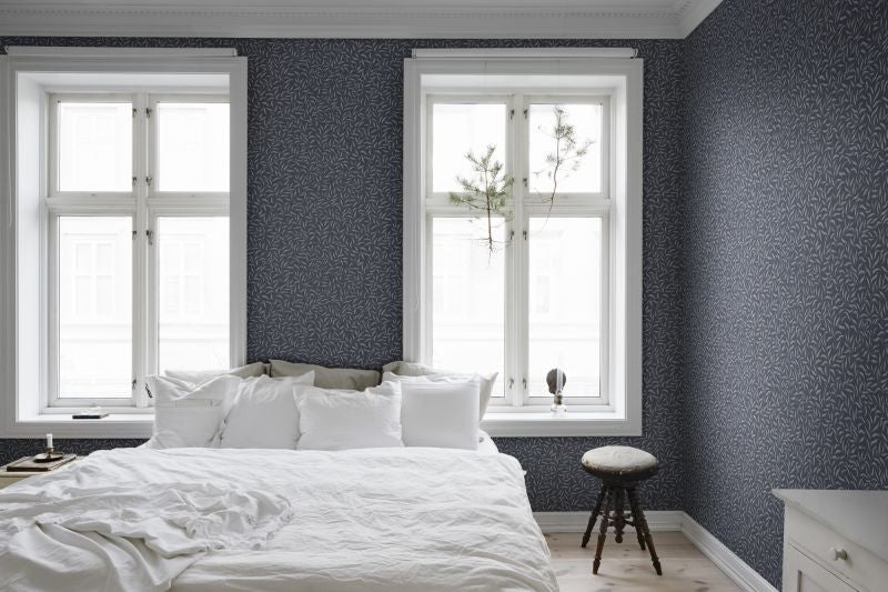 Wallpaper Karolina dark blue has a detailed pattern of pretty bay leaves that create an elegant and organic setting. Karolina makes the room into a palace garden with luscious treillage. During the Gustavian era, bay leaves were often used in carved deco rations on mirrors and furniture. Karolina is part of collection Arv that is inspired by the 18th centrury Gustavian era of Sweden. Design: Sara Bergqvist