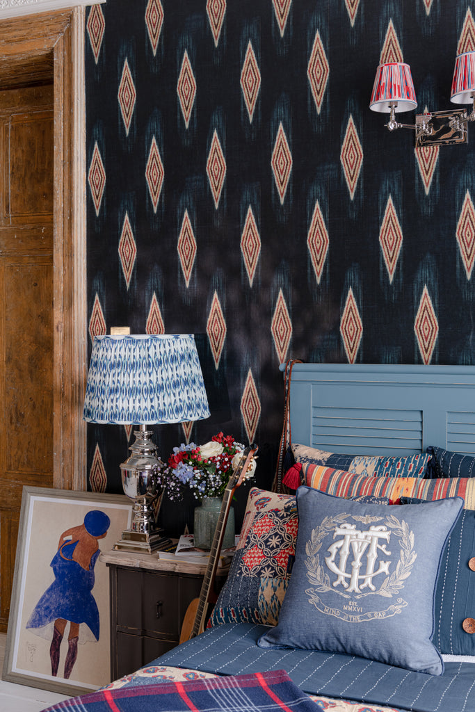 Luxuriate in the richness of hand sewn fabric with our diamond patterned MAIYSHA wallpaper which takes a painterly approach to timeless geometric shapes. Small diamonds filled with colourful echoing outlines, each layer seemingly hand sewn and celebrating the perfect imperfections of traditional textile crafts, with the overall form surrounded by organic blurs representing thread on the back of the fabric. The deep Indigo palette turns the wall into an endless night sky with flashes of earthy reds and yellows adding small sparks of brightness.