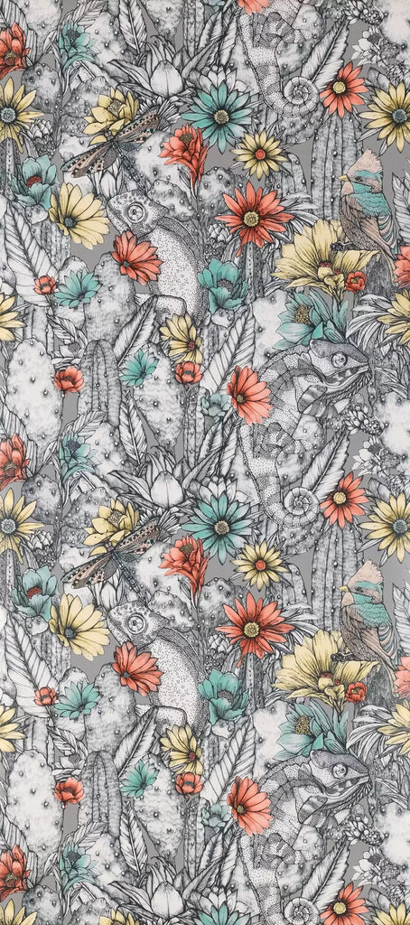 A striking depiction of various types of cactus in bloom against a monochrome background.