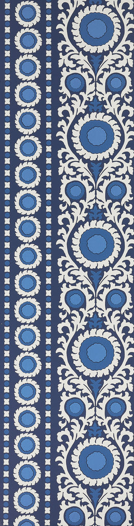A beautiful Susani inspired decorative stripe, embellished with metallic accents, captures the essence of hand-block printing. Samrina meaning flower or a fruit, is of Arabic origin.
