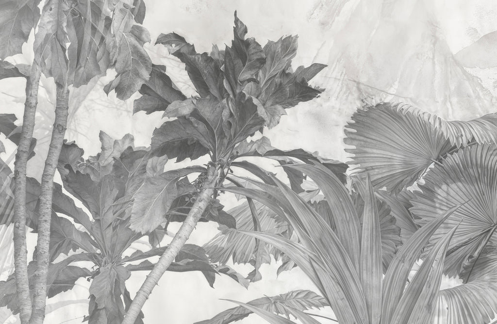 This wallcovering features a faded jungle scene in monochrome, creating a serene and sophisticated backdrop. The color palette is a calming blend of grays, blacks, and whites, evoking a cool and tranquil mood. Ideal for creating a statement wall in boutique residences, upscale hospitality environments, or executive offices seeking a touch of natural elegance.