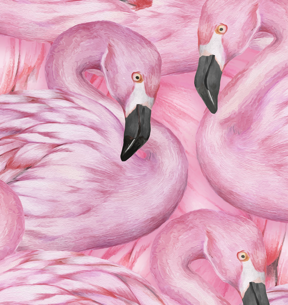 This wallcovering features a dense pattern of pink flamingos, creating a vibrant and playful visual texture. The color palette is dominated by shades of pink, accented by black beaks and white highlights, resulting in a warm and inviting mood. Ideal for creating a statement wall in boutique residences, upscale nurseries, or vibrant hospitality environments.