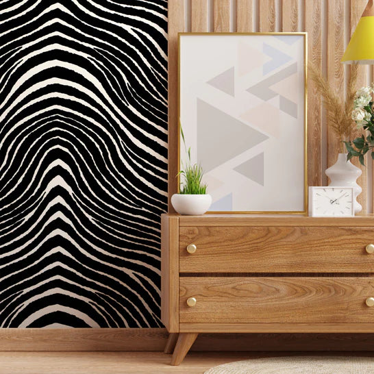 Gabby’s Zebra Stripe Flocked Velvet Wallpaper by Phillipe Romano features a rich, textured black and ivory zebra stripe pattern, combining luxe velvet flocking with a bold, retro aesthetic. Perfect for adding depth and drama to any sophisticated space. #wallstyle #luxurywalls #texturedesign