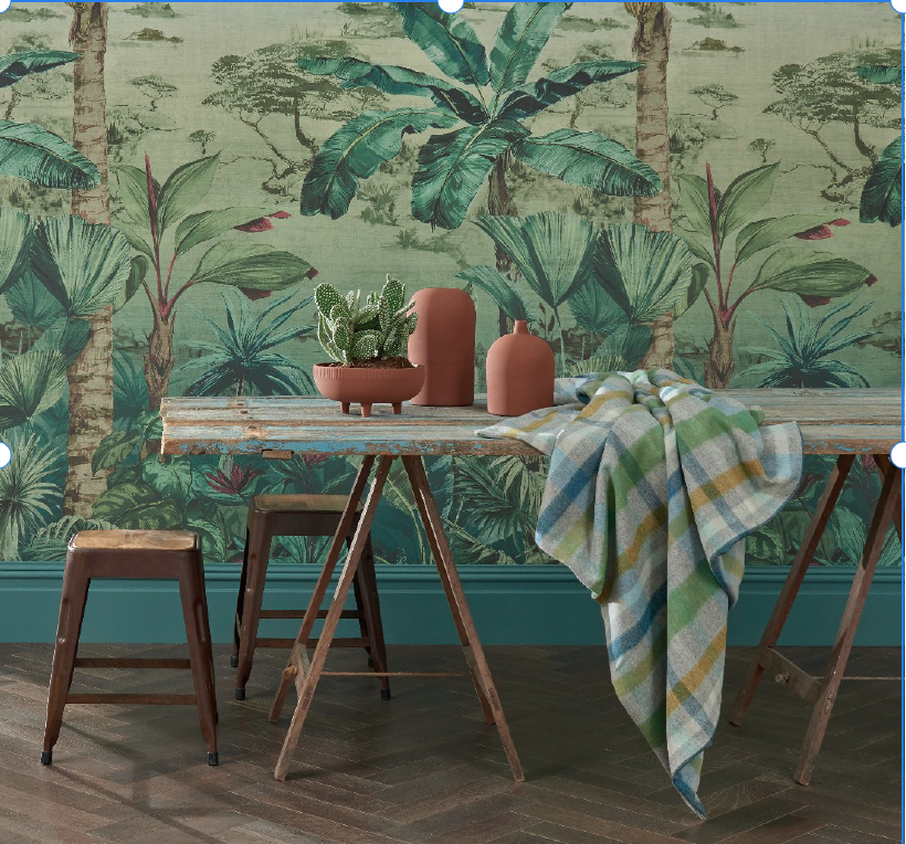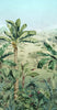 A vast panoramic landscape with mountains in the distance is viewed from the vantage point of a hilltop with lush foliage and banana palms.