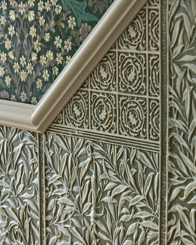 Morris Willow Boughs Dado features intricate embossed natural patterns with graceful willow branches, ideal for a refined, textured wall finish. Paintable for a bespoke touch. Elegant and timeless by Lincrusta. #homeinteriors #luxurywallcoverings #decorinspiration