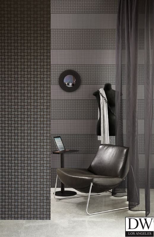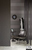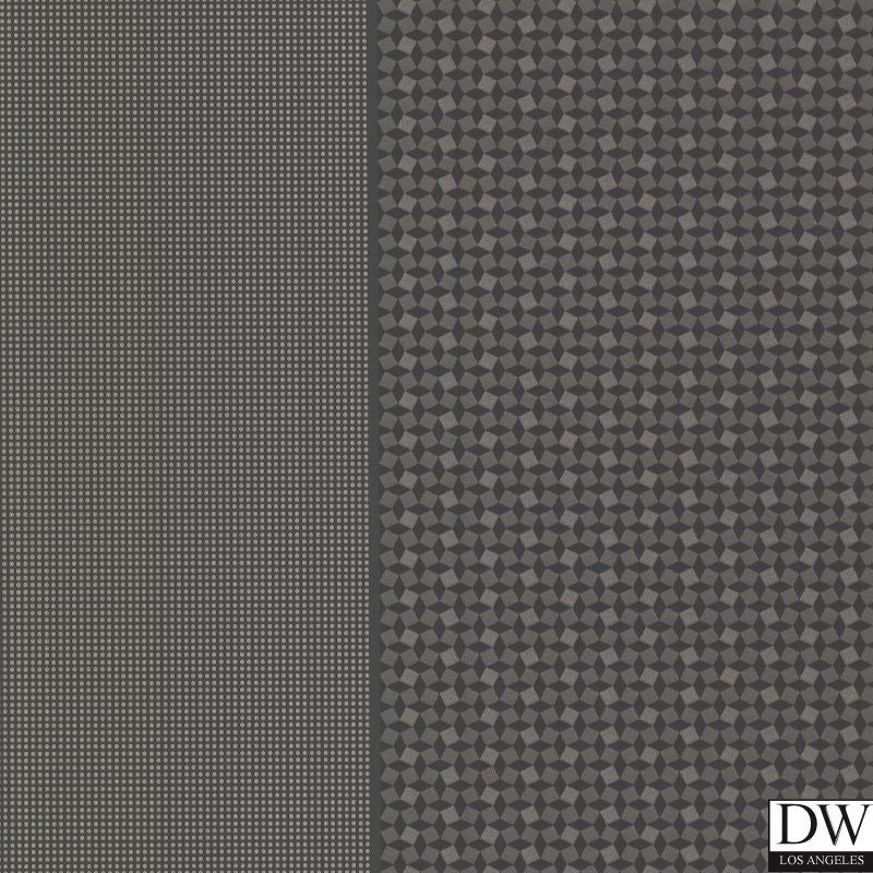 A cosmopolitan stripe wallpaper with chic geometric accents in an alluring midnight palette of black and silver. Arrange this wide striped design vertically or horizontally for a dramatic effect.