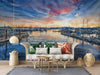 This wallcovering mural depicts a serene harbor scene at sunset, rendered in a painterly watercolor style. The color palette features a blend of blues, oranges, and grays, creating a warm and tranquil mood. Ideal for creating a calming atmosphere in hospitality environments, executive offices, or boutique residences.