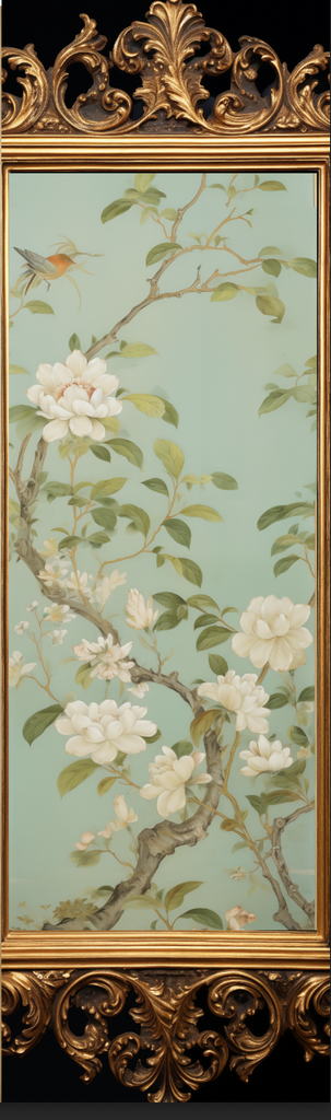 We are thrilled to present a wallpaper product designed to add an artistic and illusionistic touch to any room, this unique offering comes in panels featuring a trompe l'œil effect of a picture frame with art on a patterned wallpaper background.