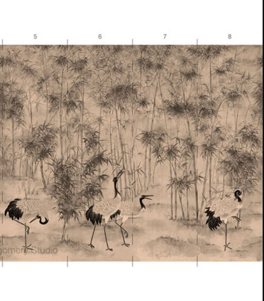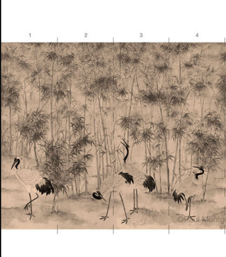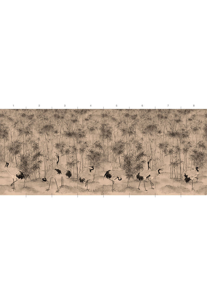 The Bamboo and Cranes Sepia Mural by Paul Montgomery Studios features graceful cranes amidst delicate bamboo stalks in a calming sepia palette, blending nature and artistry seamlessly. Perfect for refined, serene interiors. #wallart #luxurydesign #murals