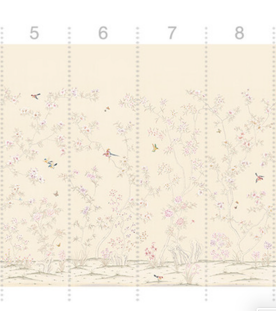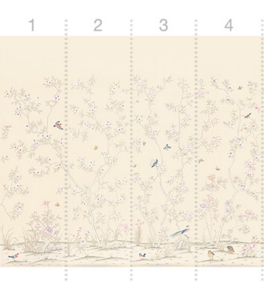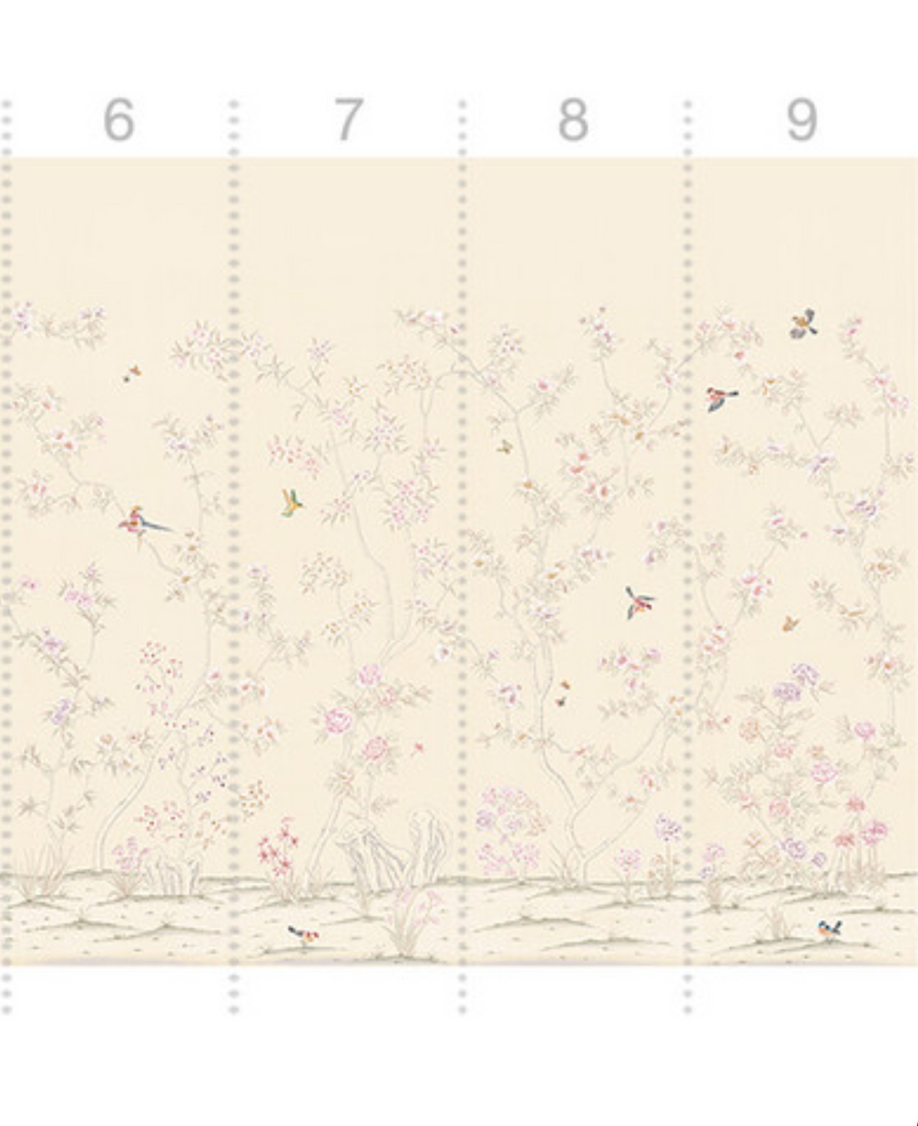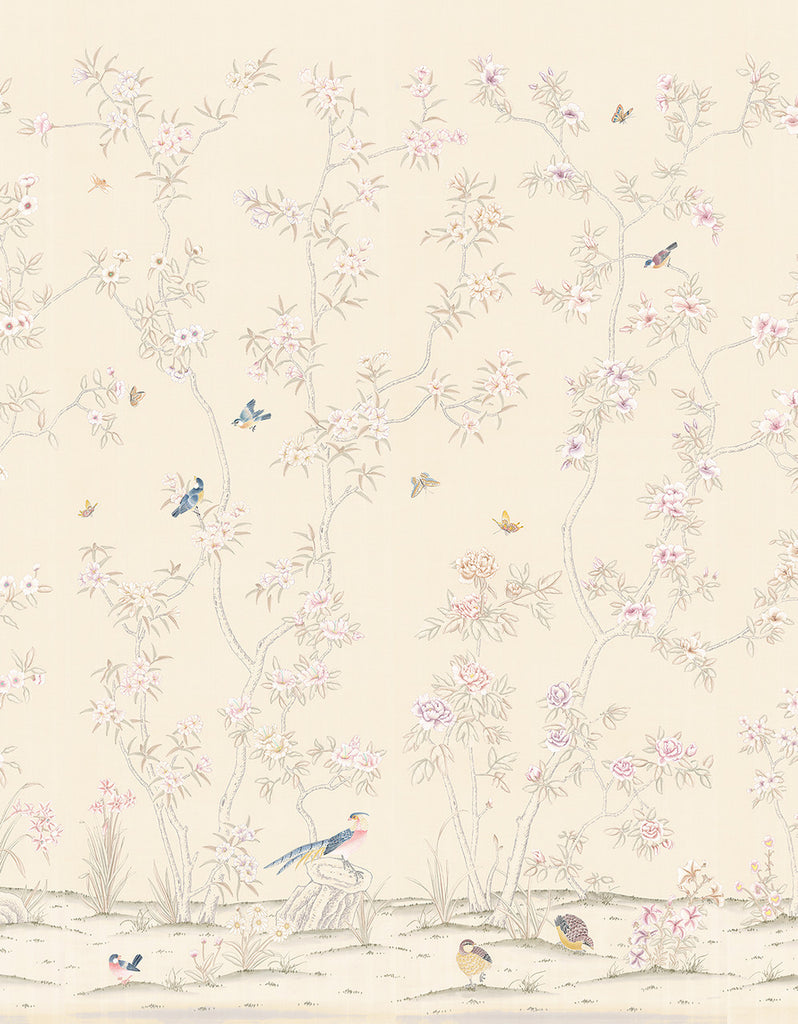 Biarritz is a lovely garden mural with flowering trees and birds on a soft background. 9 Panels Available in Full Length/Headers/Footers, Sold in individual Panels, Width: 36", Design Height: 132", Total Height: 108", Biarritz,Paul Montgomery Studios