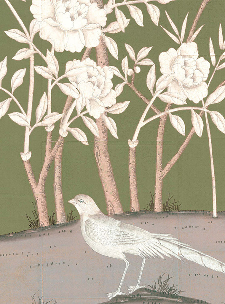 Birds of Flight is based on Mural Source chinoiserie classics. Consisting of monochromatic foliage and bold background colors, this classic subject matter is portrayed in a stunning modern fashion. 3 Panels Available in Full Length/Headers/Footers, Sold in individual Panels, Width: 30" 36", Design Height: 108", Total Height: 102", Birds of Flight,Paul Montgomery Studios