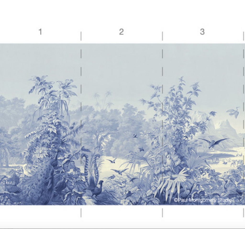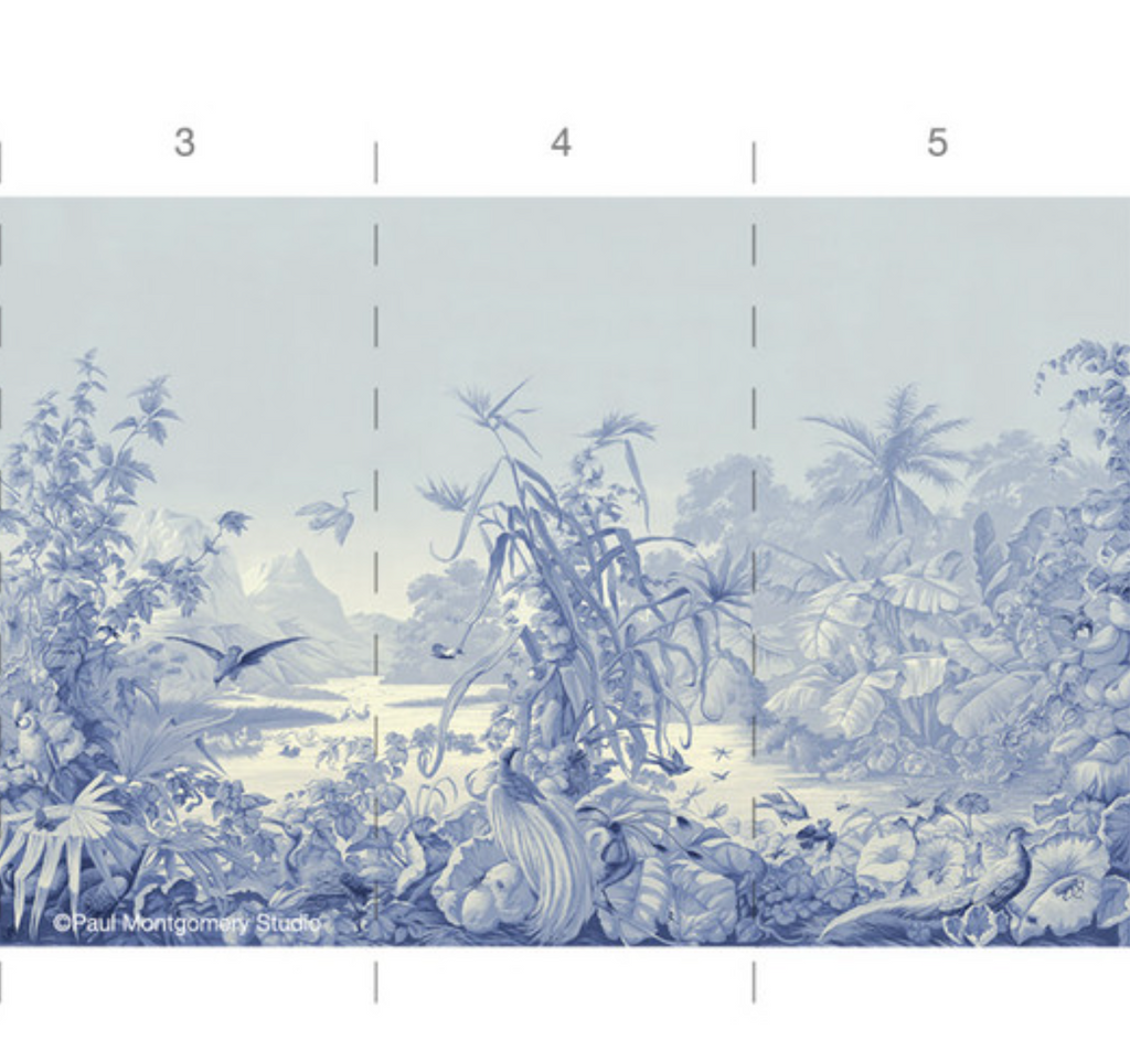Brazil, one of the beautiful panoramic murals offered by The Mural Source, is a re-creation of a classical tropical landscape mural with beautiful birds, palms and mountains of the Brazilian Amazon. 5 Panels Available in Full Length/Headers/Footers, Sold in individual Panels, Width: 36", Design Height: 76" 72", Total Height: 60", Brazil,Paul Montgomery Studios