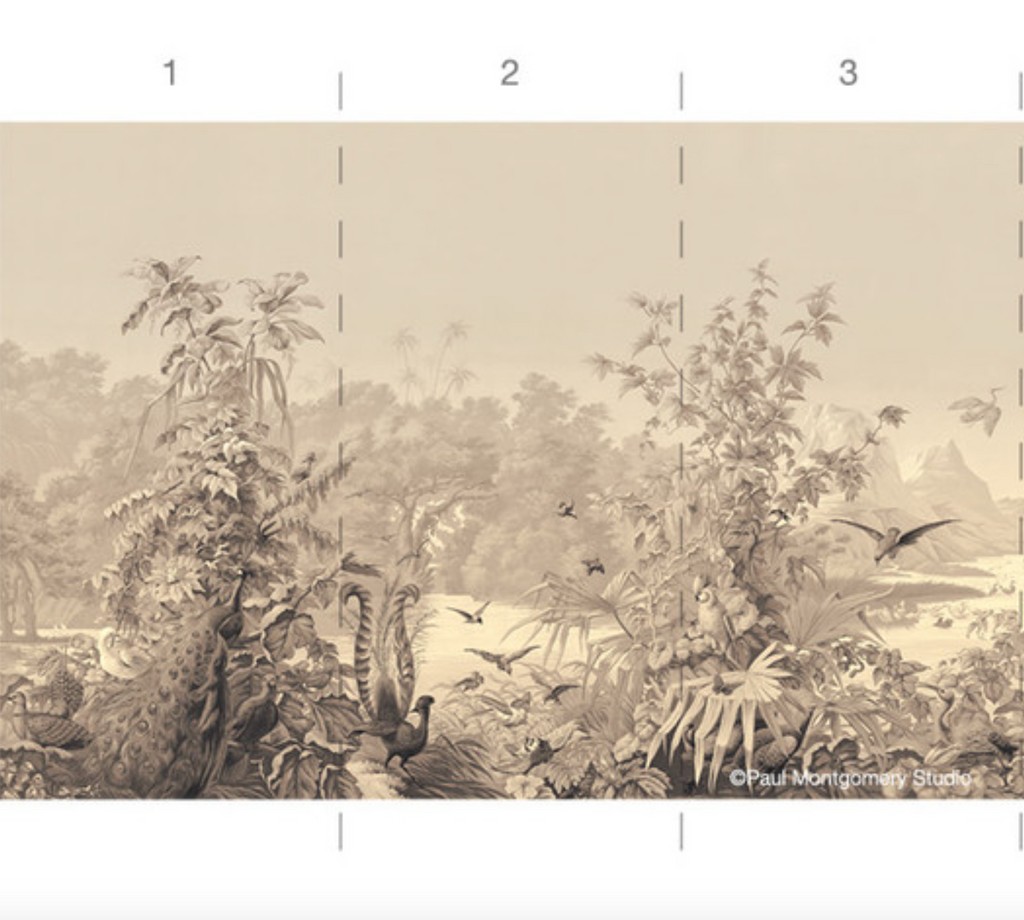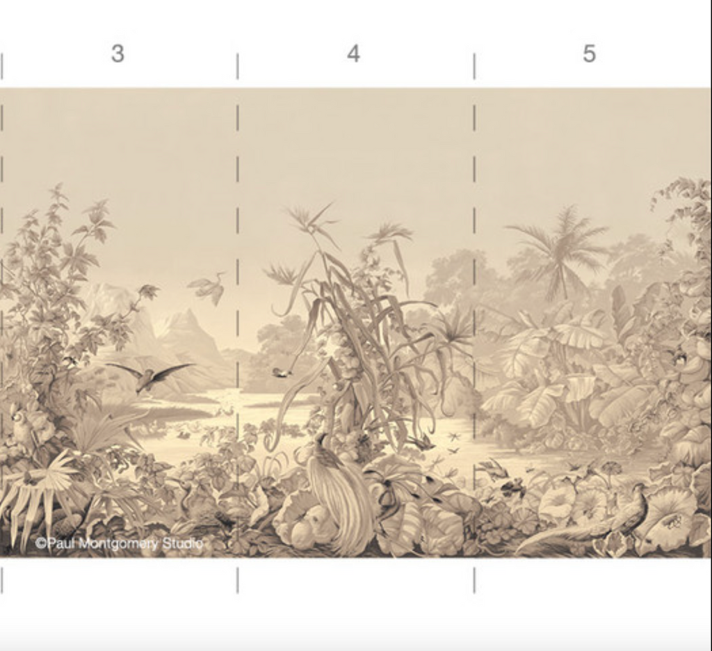 Brazil, one of the beautiful panoramic murals offered by The Mural Source, is a re-creation of a classical tropical landscape mural with beautiful birds, palms and mountains of the Brazilian Amazon. 5 Panels Available in Full Length/Headers/Footers, Sold in individual Panels, Width: 36", Design Height: 76" 72", Total Height: 60", Brazil,Paul Montgomery Studios