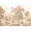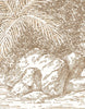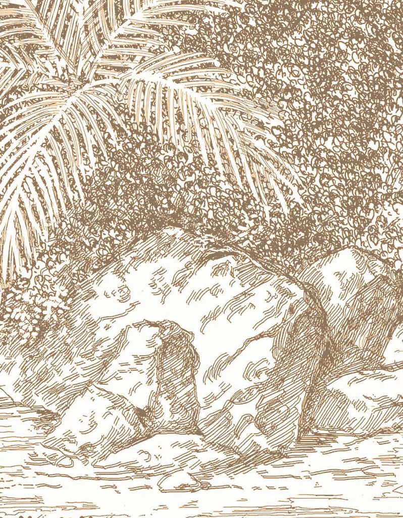 Hawaii depicts an idyllic tropical island landscape rendered in a style reminiscent of an old world etching.