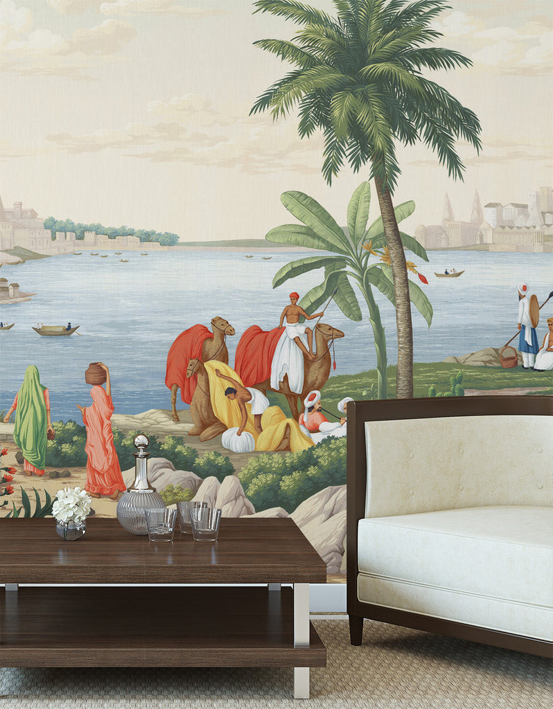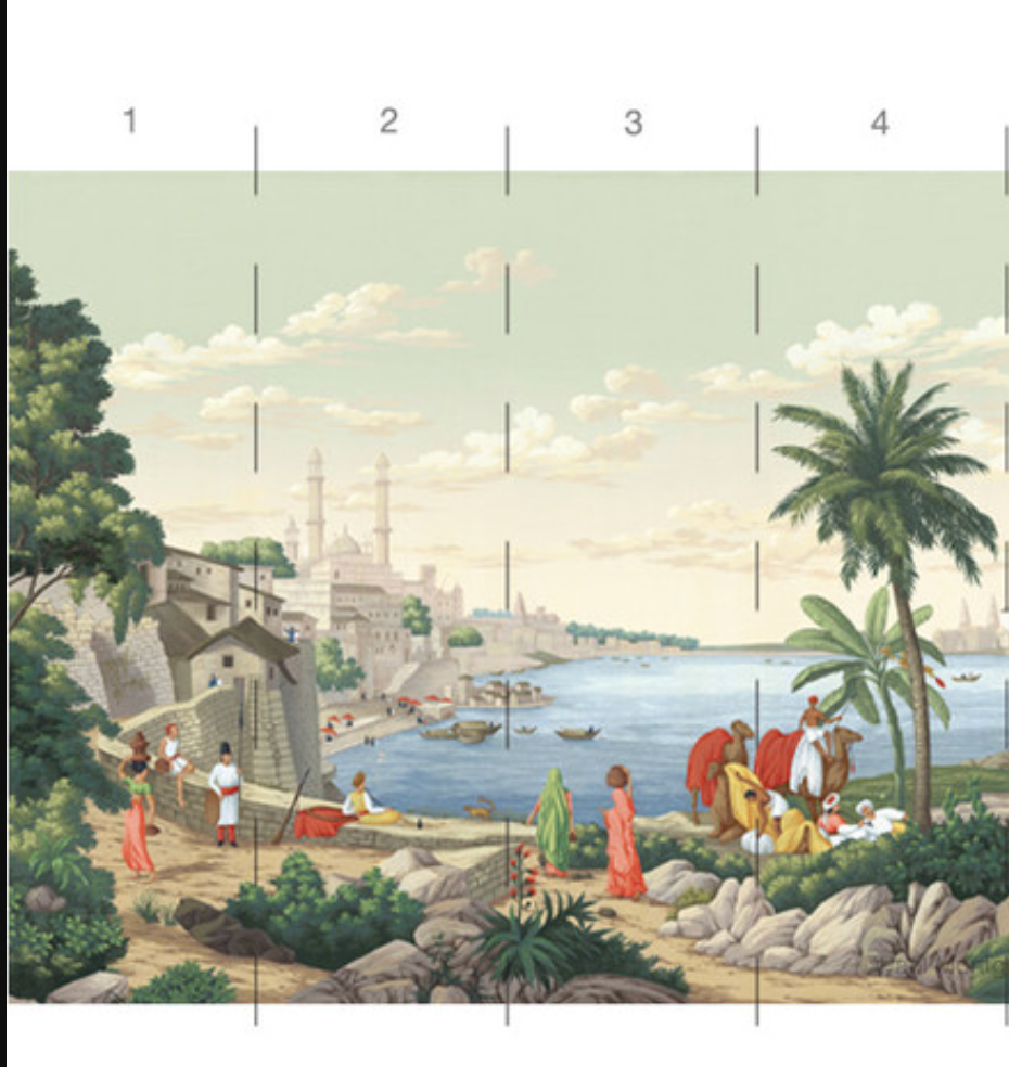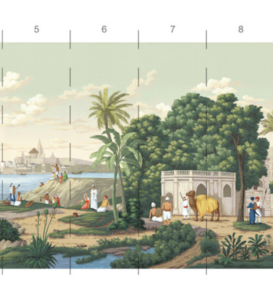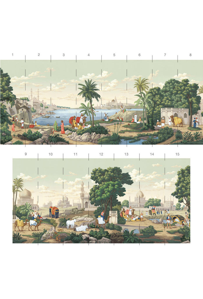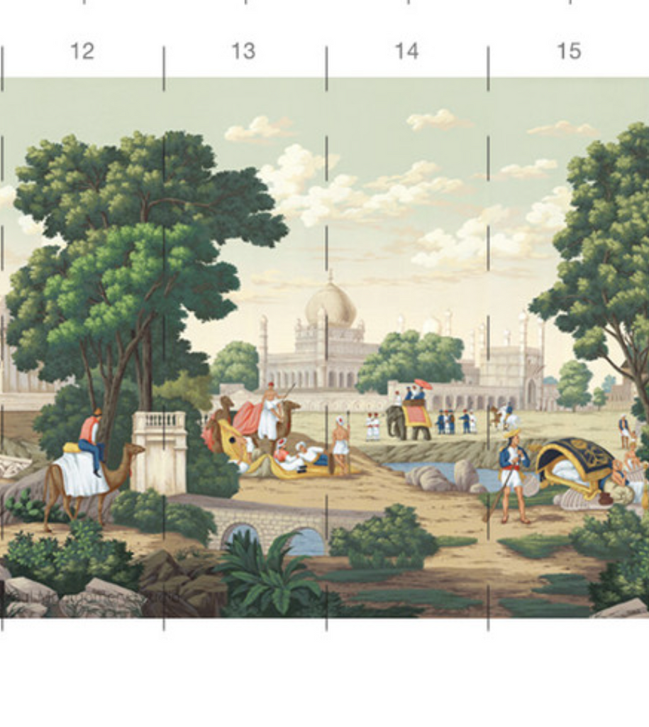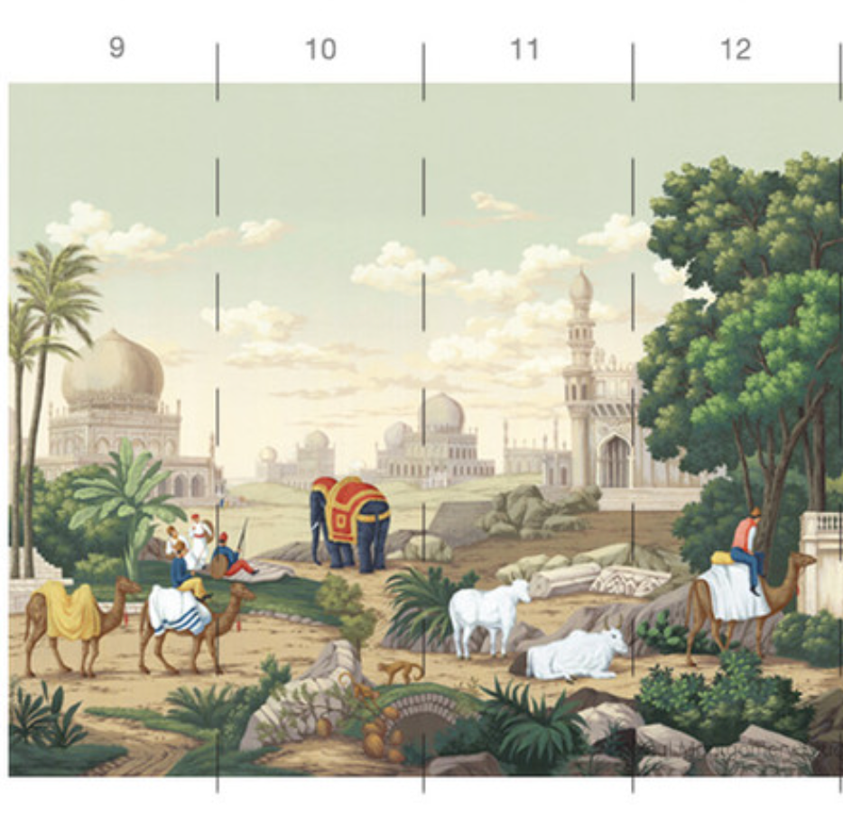 India is a romantic depiction of classical India filled with elephants, camels, temples and iconic Indian architecture. 15 Panels Available in Full Length/Headers/Footers, Sold in individual Panels, Width: 36", Design Height: 120", Total Height: 108", India,Paul Montgomery Studios