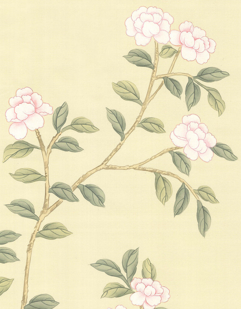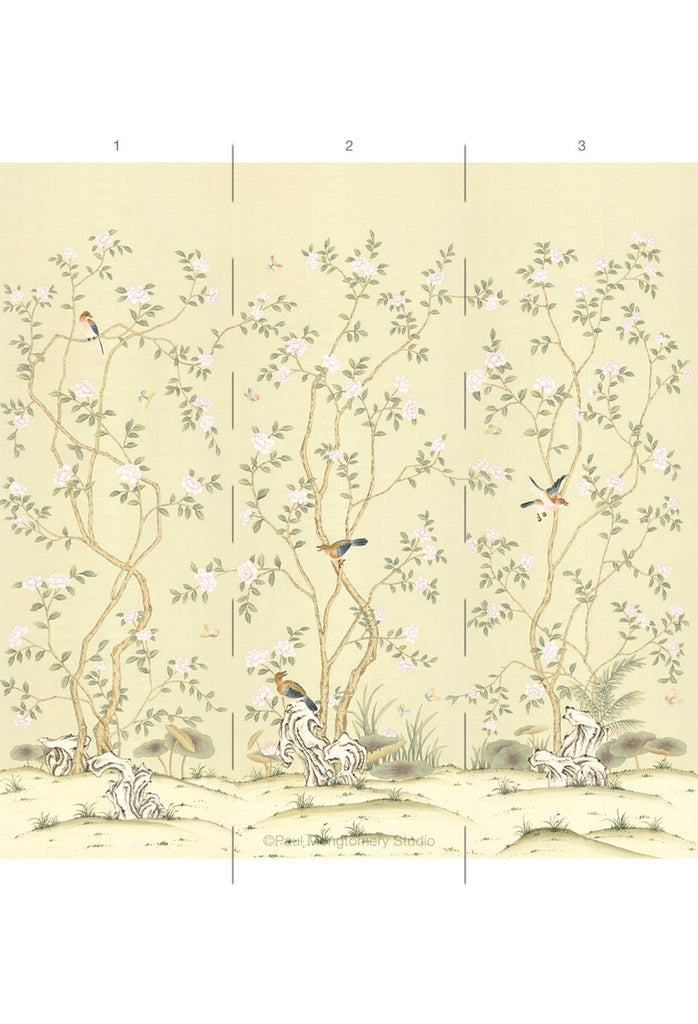 Lantilly is a beautiful chinoiserie mural on a soothing cream background with flying birds and delicate flowers. 3 Panels Available in Full Length/Headers/Footers, Sold in individual Panels, Width: 36", Design Height: 108", Total Height: 98", Lantilly Cream,Paul Montgomery Studios