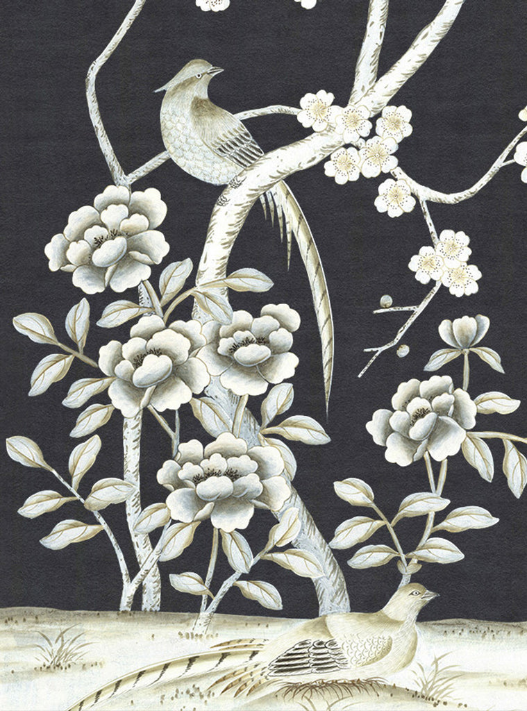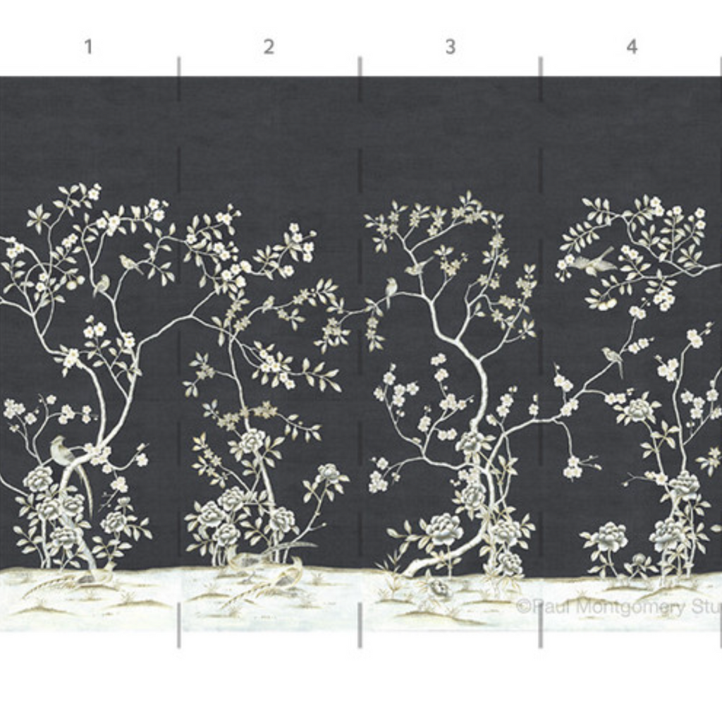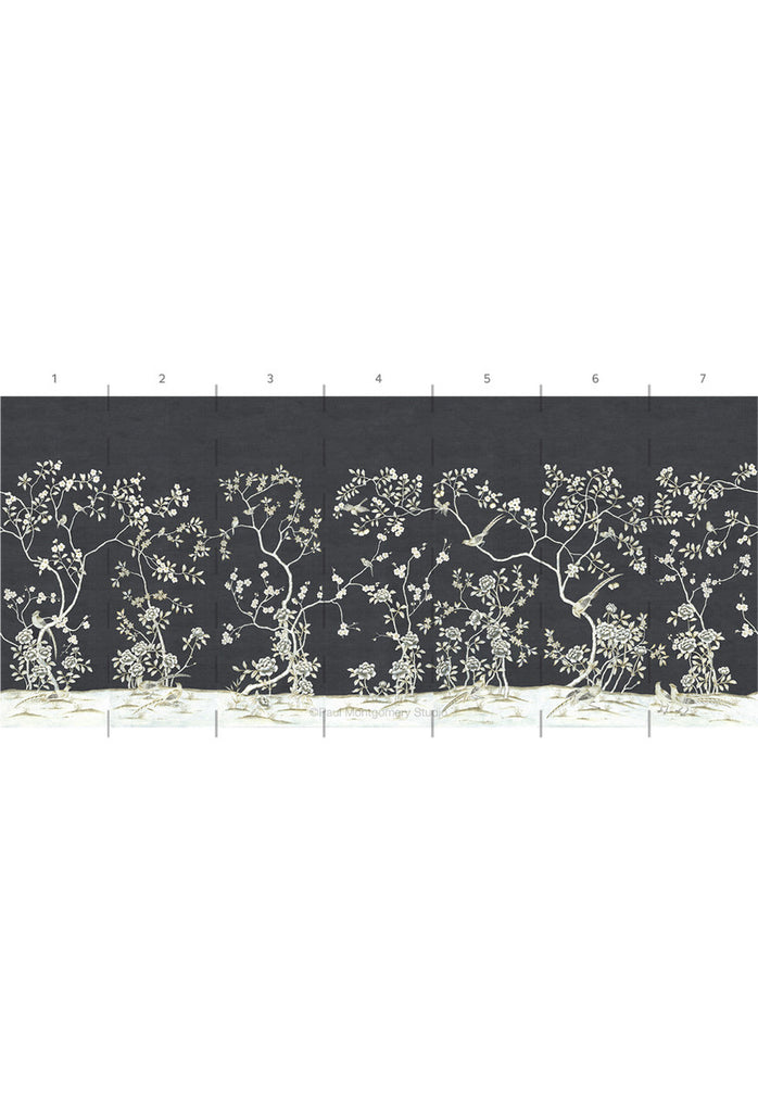Maysong Charcoal is a beautiful chinoiserie mural with large white blooms on a dark grey background. 7 Panels Available in Full Length/Headers/Footers, Sold in individual Panels, Width: 36", Design Height: 96", Total Height: 89", Maysong Charcoal,Paul Montgomery Studios