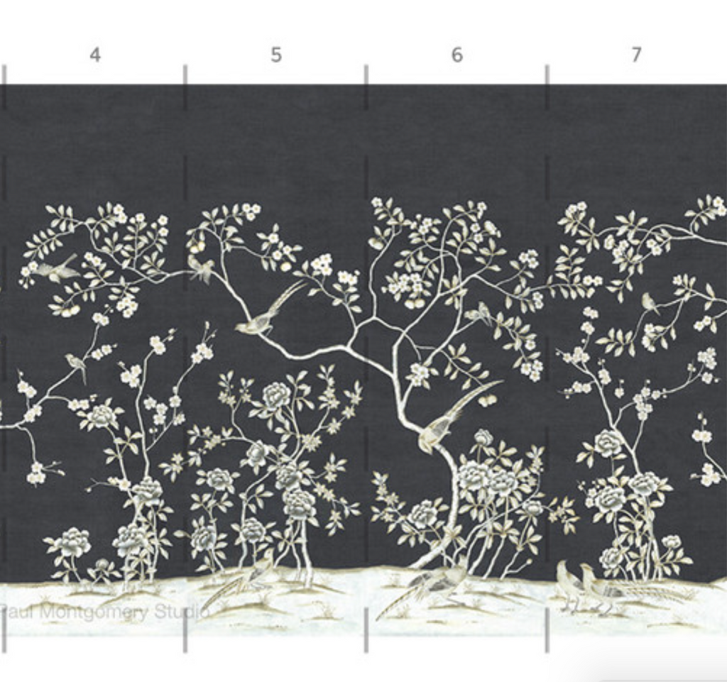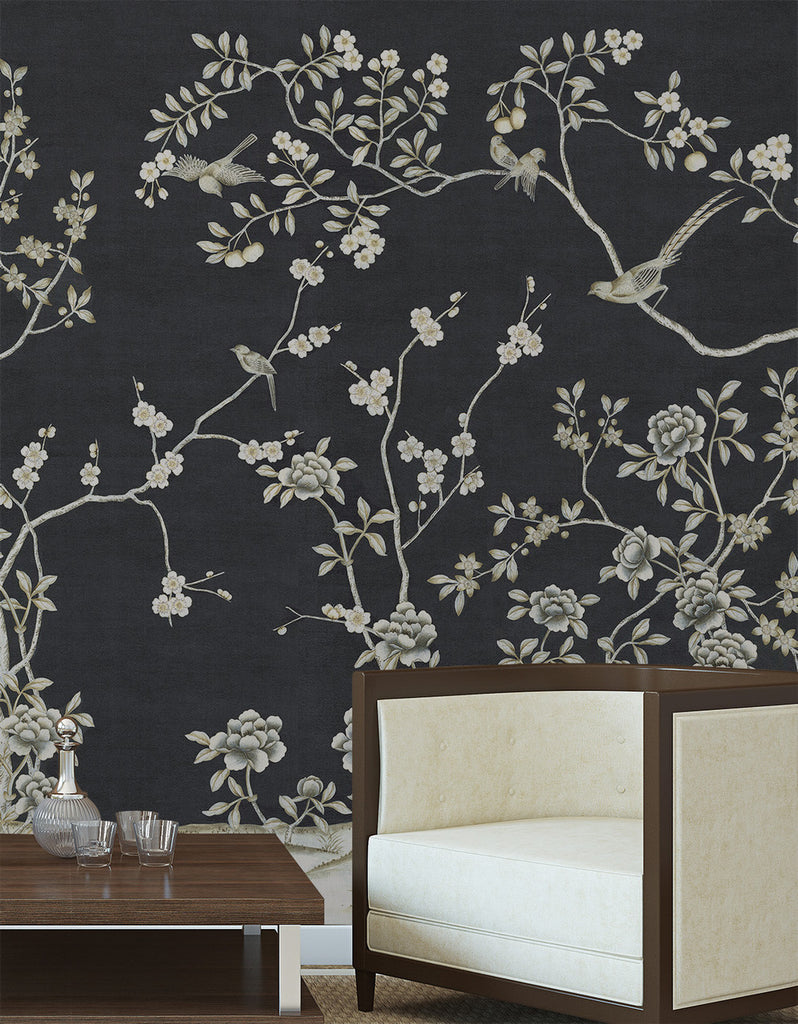 The Maysong Charcoal Mural by Paul Montgomery Studios features a sophisticated design with intricate organic patterns in deep charcoal tones, creating an elegant and moody ambiance. Ideal for refined spaces seeking depth and texture. #wallart #luxuryinteriors #designerwallcoverings