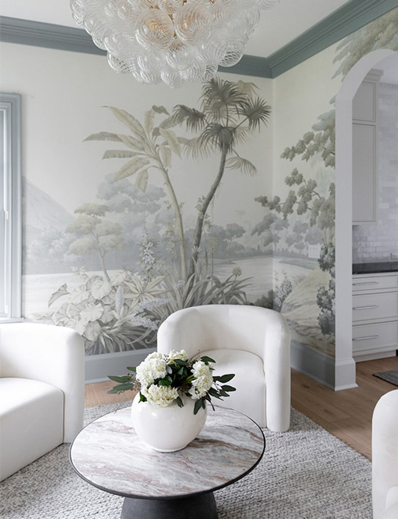Paradiso Grisaille Mural by Paul Montgomery Studios showcases a serene blend of muted tones with intricate, nature-inspired motifs, evoking timeless elegance and artistic depth. Perfect for a sophisticated and tranquil interior backdrop. #luxurydesign #murals #interiordecor