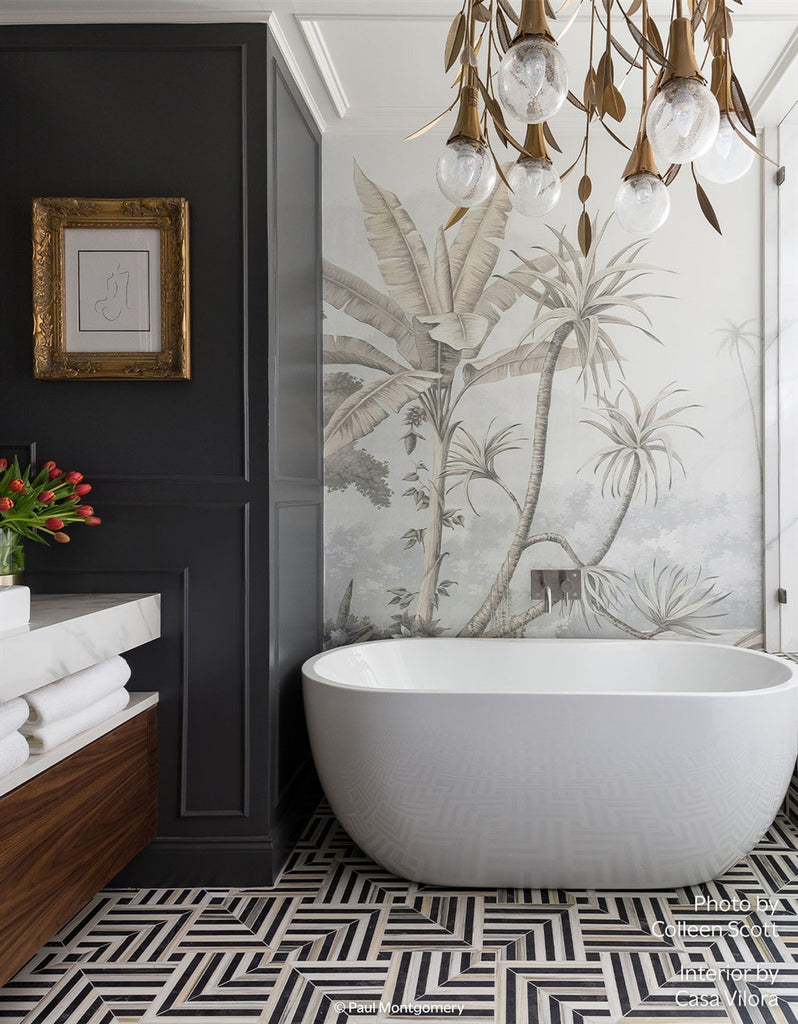 The Paradiso Grisaille Mural by Paul Montgomery Studios features intricate, monochromatic motifs reminiscent of classical engravings, creating a timeless and sophisticated ambiance. Perfect for elevating interiors with subtle elegance. #luxurydesign #murals #wallart