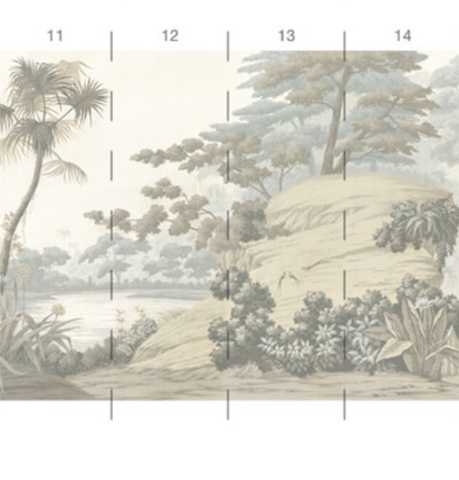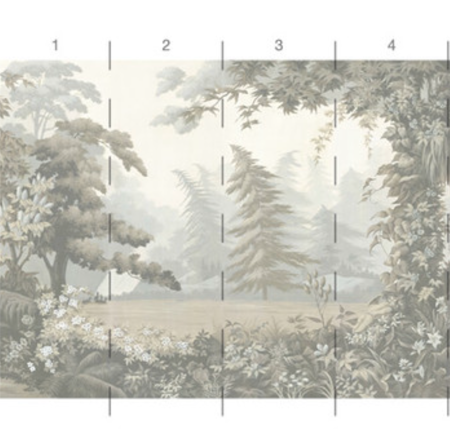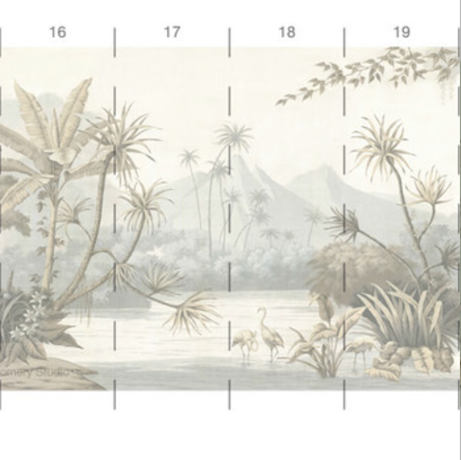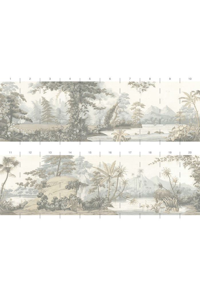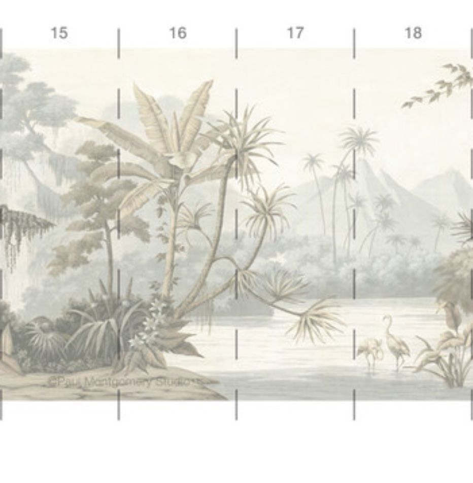 Paradiso Grisaille is a romantic tropical landscape with dense jungle foliage in warm grey tones. 20 Panels Available in Full Length/Headers/Footers, Sold in individual Panels, Width: 36", Design Height: 108", Total Height: 108", Paradiso Grisaille,Paul Montgomery Studios
