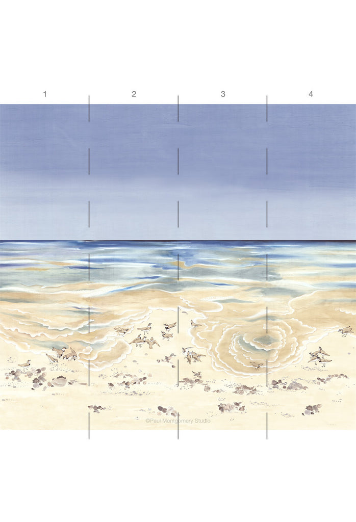 Seashore is a modern Japanese fusion mural inspired by our love of the beach. A beautiful color palette of warm sandy tones with deep blue water sets the backdrop for quirky stylized Sandpiper birds. 4 Panels Available in Full Length/Headers/Footers, Sold in individual Panels, Width: 36", Design Height: 132", Total Height: 132", Seashore,Paul Montgomery Studios