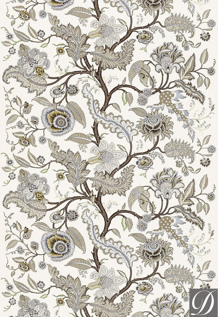 The traditional tree of life featured in Sinhala Linen Print by Martyn Lawrence Bullard is derived from an antique French indienne printed cotton fabric. The interpretation of color and scale is a fresh look at this classic design, while a background of meandering dotted vermicelli adds patterned interest. This wallcovering has been recreated in a dramatic single panel width in a range of clear, saturated and neutral hues that address the palettes of modern interior spaces and can be paired with the Sinhala Linen Print fabric to provide the ultimate option for a statement room